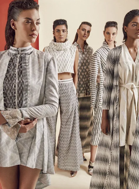 O editorial celebra o tradicional tecido Ikat, típico da Ásia e que utiliza técnicas artesanais de tingimento.
